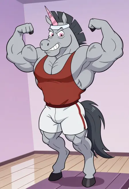 强化提示:“毛茸茸的,雄性,粉红色眼睛,马尾,单角”