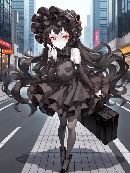 의상 키워드 ・l_clothes, 검은 드레스, 리본, 프릴 드레스, 검은 리본, 분리된 소매, 검은 팬티스타킹, 검은 신발, 하이힐,