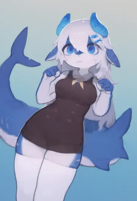 角、尾、魚の尾、長い髪、サメの尾、青い目、色付きの肌、青い角、白い肌、白い髪、ヒレ、青い肌、サメガール、中くらいの胸、髪飾り、魚の髪飾り、多色肌、目と目の中の髪、