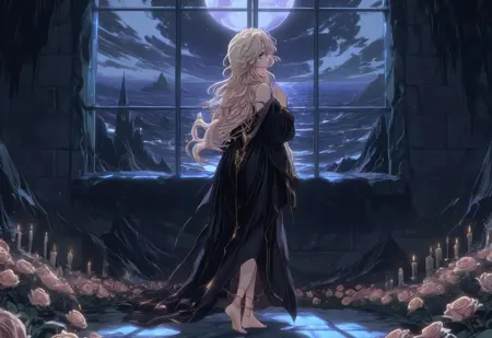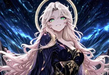Create depictions of the Auric Aria, the One True God of Gateway to Genesis. A goddess with messy hair threaded in gold and rose-pink and eyes of glowing emerald. Wearing a hanfu-inspired cosmic robe of deep purples and midnight blues, she moves with orchestral grace through moonglow ruins and star-swept shores, her golden filigree catching celestial light. Serene yet unyielding, Aria embodies compassion and resolve, shifting from whispered prayer to proud and confident standing, her silhouette carved in chiaroscuro and her emotions rendered in painterly detail in a 90s anime style