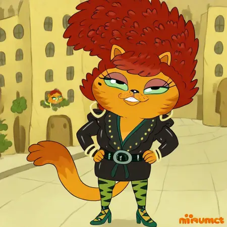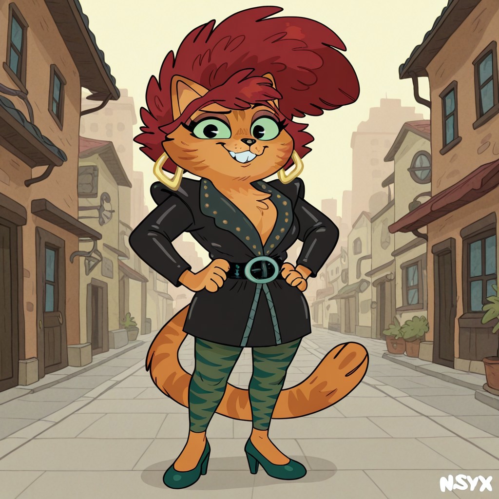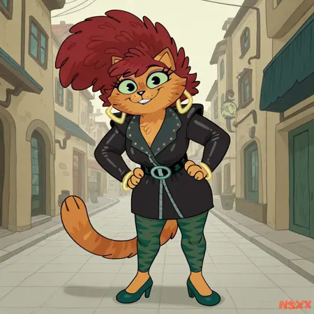 tabby cat, cat girl, orange fur, red hair, big hair, black pupils, green sclera, black nose, cat ears, cat tail, hoop earrings, leather jacket, belt, green and black leggings, green high heels,