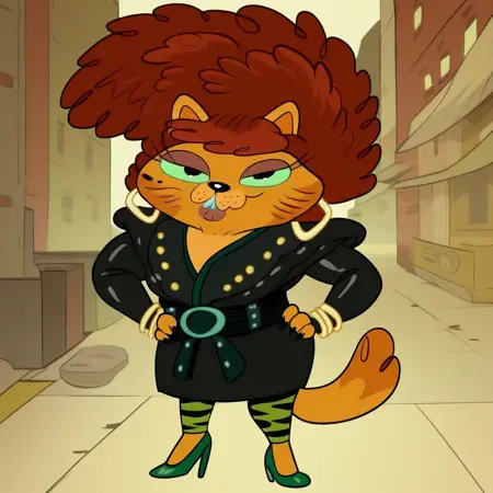 tabby cat, cat girl, orange fur, red hair, big hair, black pupils, green sclera, black nose, cat ears, cat tail, hoop earrings, leather jacket, belt, green and black leggings, green high heels,