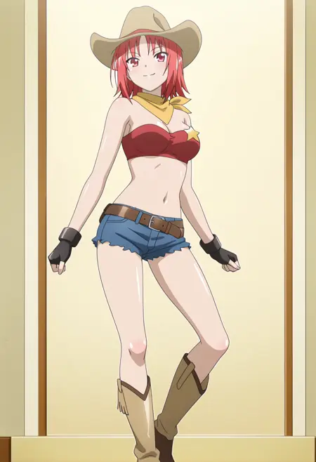 cowboy hat, yellow bandana, bare shoulders, red bandeau, cleavage, star (symbol), black fingerless gloves, navel, midriff, belt, denim shorts, boots