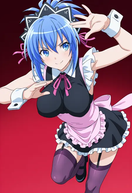 maid headdress, pink hair ribbon, maid, pink neck ribbon, sleeveless, frills, pink waist apron, frilled apron, wrist cuffs, black miniskirt, frilled skirt, garter straps, purple thighhighs, black mary janes