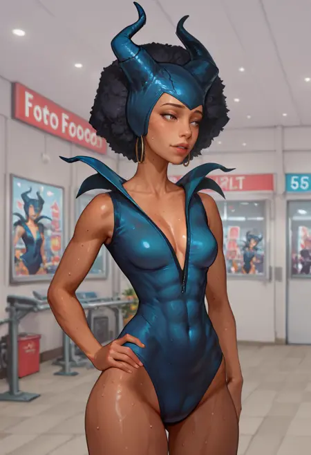マレフィセントコスプレ、濃い青のジッパー付きレオタード、濃い青の偽の角、ジッパーを開けた状態、胸元