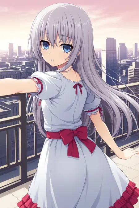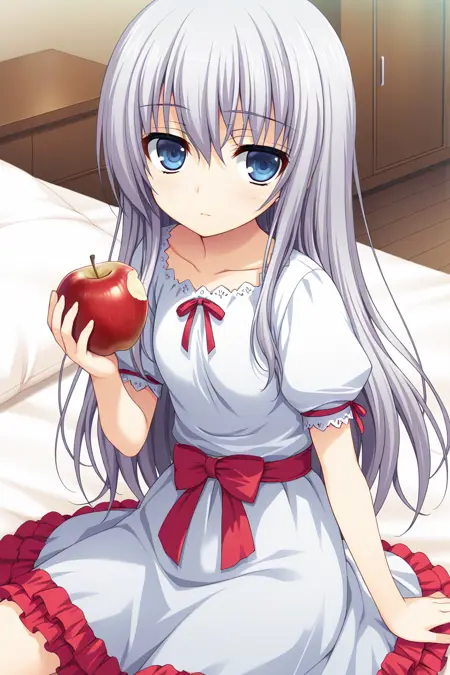 white dress,frilled dress,lace-trimmed dress,collarbone,neck ribbon,red ribbon,jagged neckline,puffy short sleeves,sleeve ribbon,red sash,waist bow,red bow,red frill,