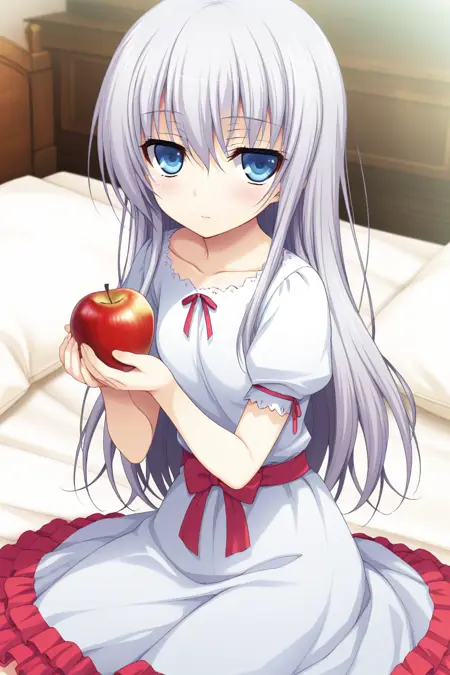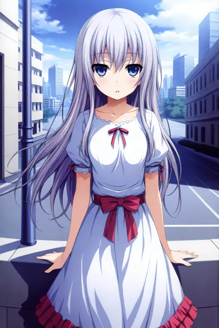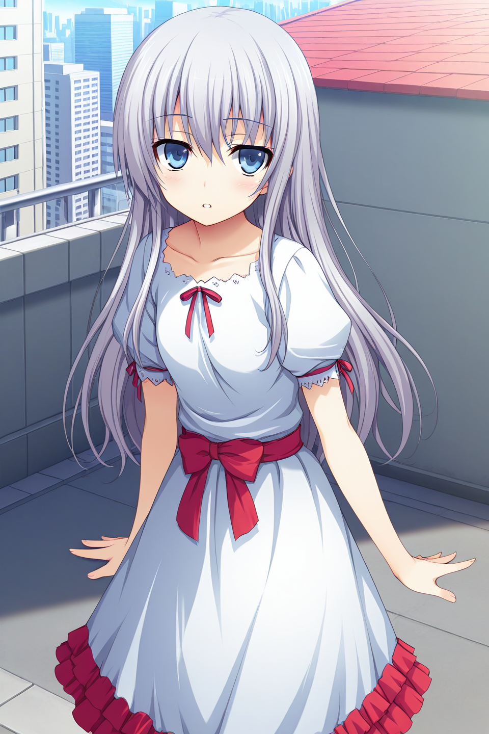 white dress,frilled dress,lace-trimmed dress,collarbone,neck ribbon,red ribbon,jagged neckline,puffy short sleeves,sleeve ribbon,red sash,waist bow,red bow,red frill,