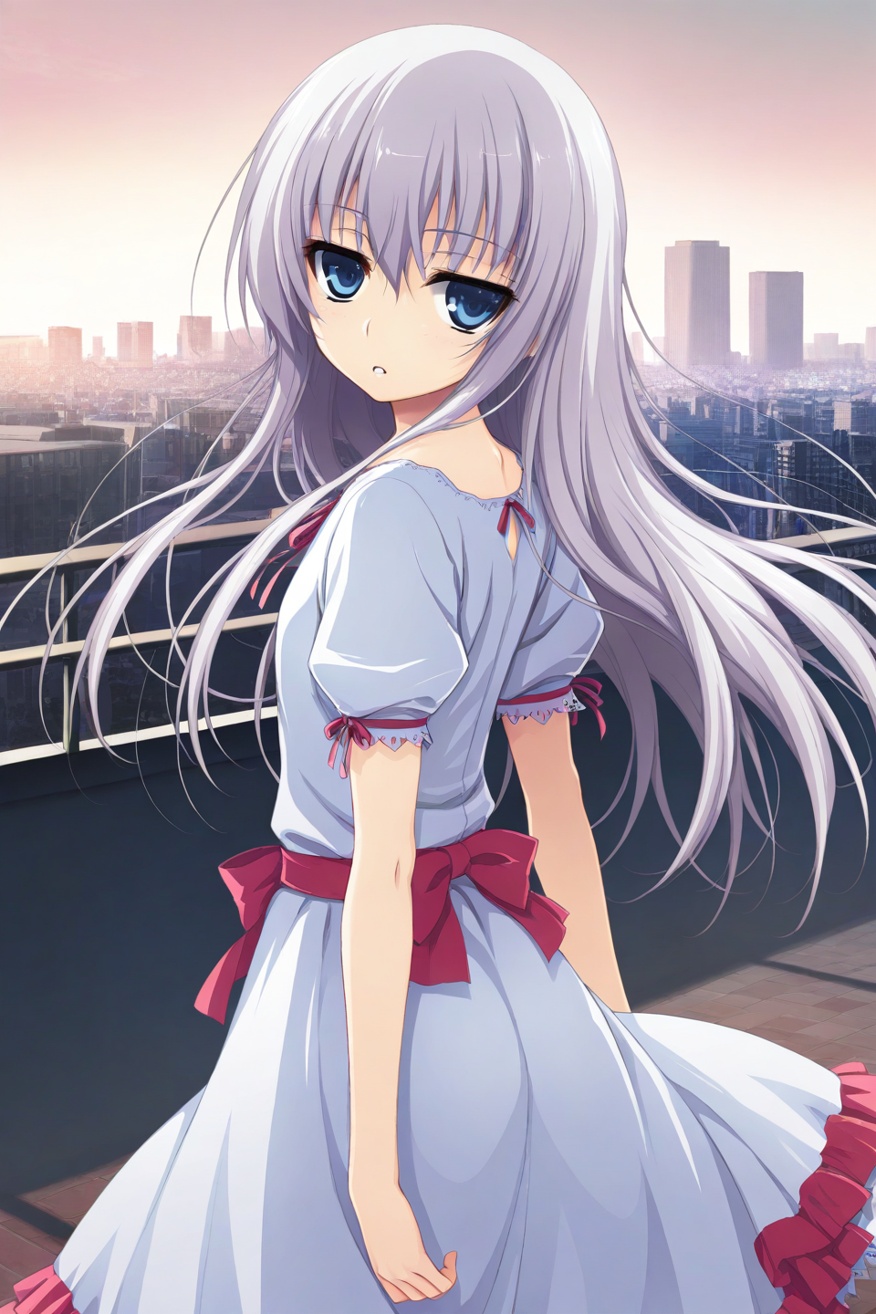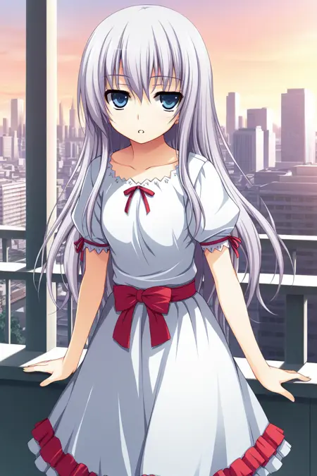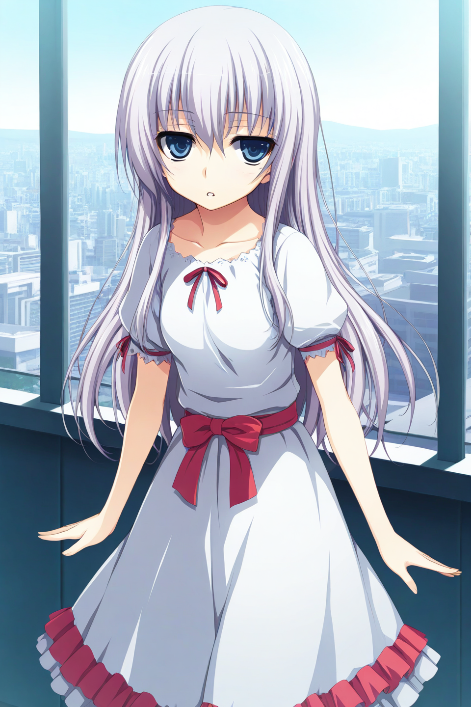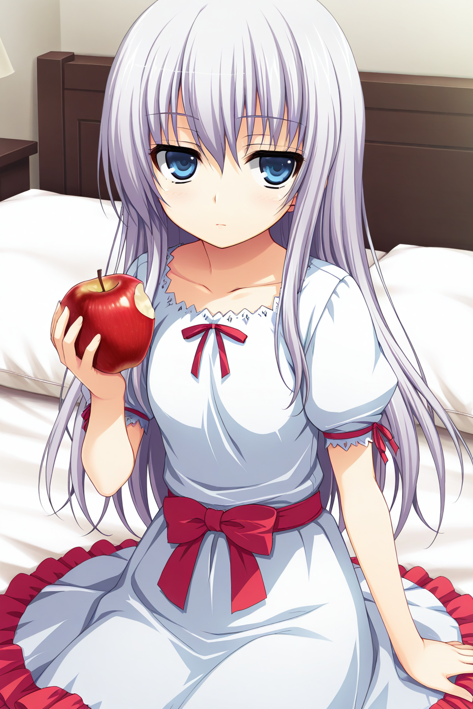 white dress,frilled dress,lace-trimmed dress,collarbone,neck ribbon,red ribbon,jagged neckline,puffy short sleeves,sleeve ribbon,red sash,waist bow,red bow,red frill,