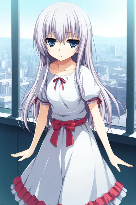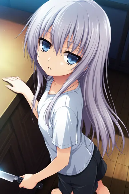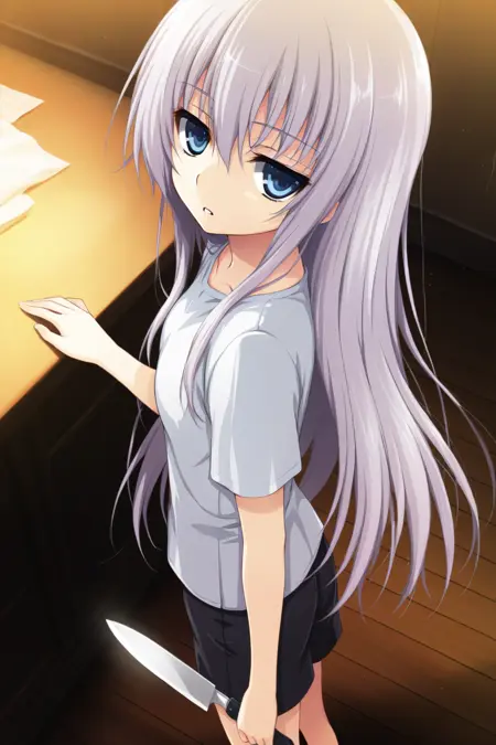 haku-akatsuki,blue eyes,grey hair,hair between eyes,very long hair,straight hair,jitome,petite,