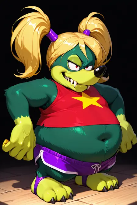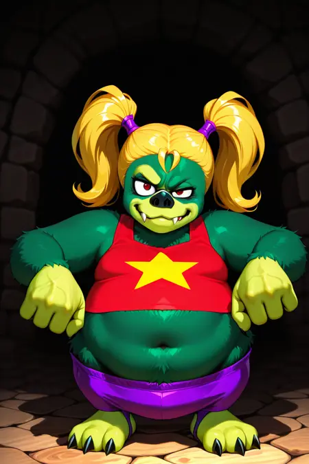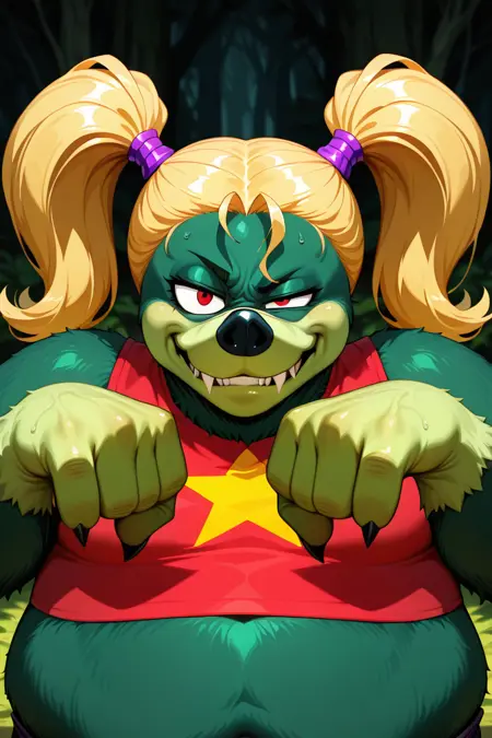 Prompt: Ugly Tooty, solo, 1girl, monster, Bear, no human, obese, Green fur, asymmetrical Eyes, one eye larger, red Eyes, Black Nose, fangs, pig tails, Blonde hair, purple hairties, cowlick, long arms, short legs, red crop top, yellow Star logo, purple pants, purple stirrup pants, no shoes