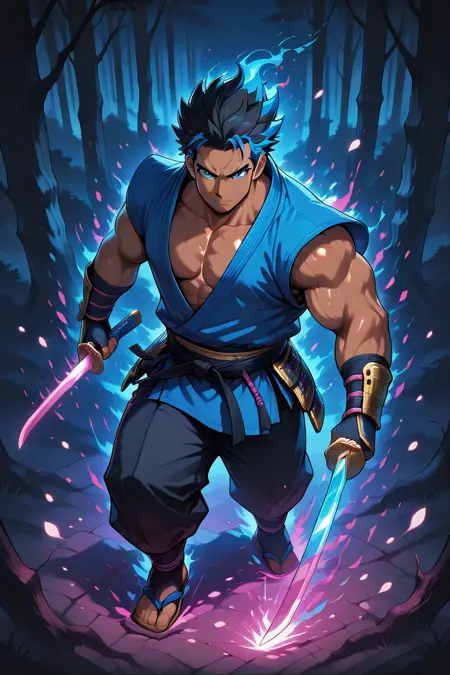 루탈로SPF, 1명, 남성, 성숙한 남성, 근육질, 갈색 피부, 빛나는 노란 눈, 빛나는 밝은 파란 머리, 검은 눈썹, 흰 기, 금색 스카프, 금색 무술 띠, 검은 바지, 검은 부츠, 물 아우라,