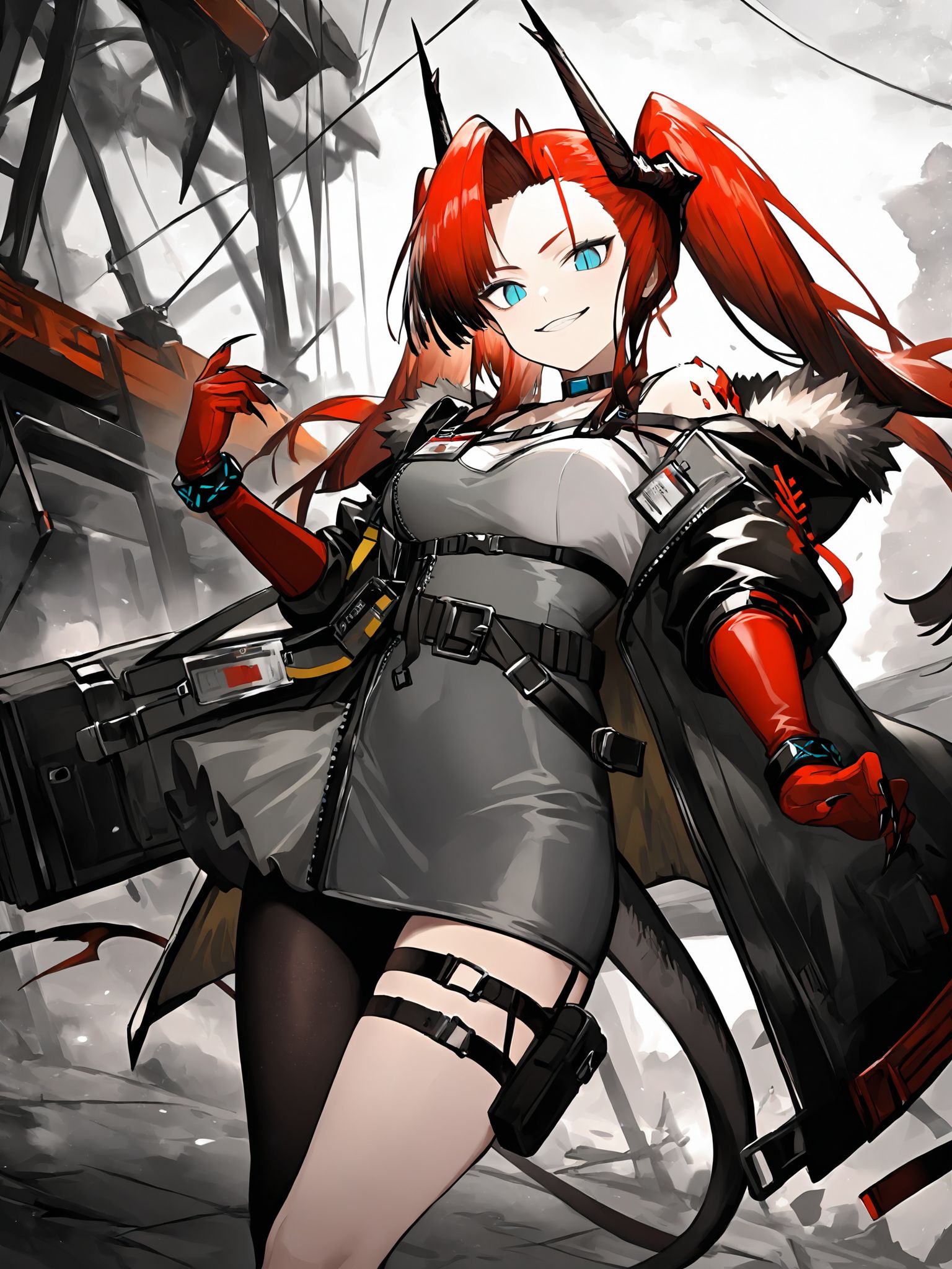 | トレーニングワード | arnttoddifons,twintails,long hair,red hair,forehead,blue eyes,slit pupils,horns,medium breasts,tail,コピーしました! choker,grey dress,off shoulder,bare shoulders,oripathy lesion (arknights),red lesion,fur trim,belt,id card,white shirt,see-through,elbow gloves,red gloves,claws,black nails,grey skirt,asymmetrical legwear,pantyhose,thighhigh,thigh strap,red footwear,high heels,コピーしました! |