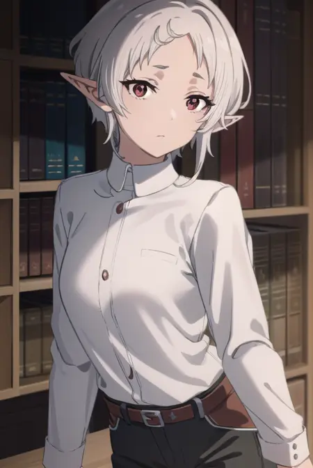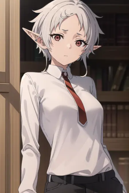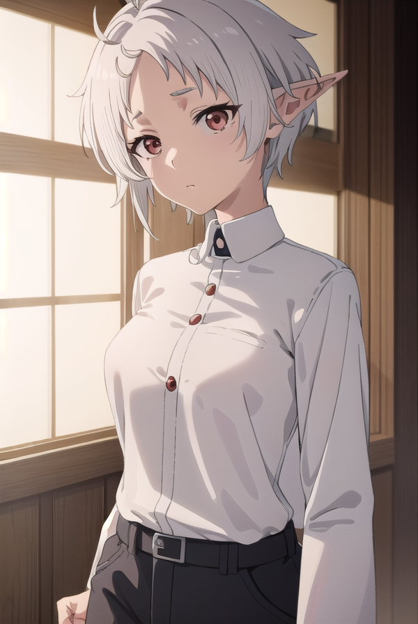 sylphy, short hair, ahoge, white hair, pointy ears, (red eyes:1.5), elf,