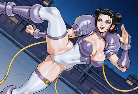 ** 칼라, 가슴선, 흰색 허벅지 스타킹, 갑옷, 부츠, 레오타드, 배꼽 가림, 어깨 보라색 갑옷, 팔뚝 보호대, 어깨 패드, 팔더런,**