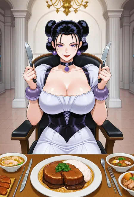 태그: 바라 마담셀, 보라색 머리, 빨간 립스틱, 더블 버, 머리 장식, 머리 뭉치, 초커, 메이크업,
