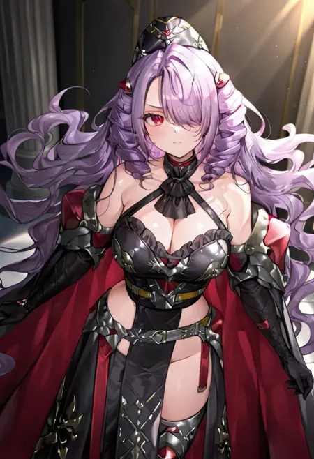 purple hair,long hair,drill hair,wavy hair,hair over one eye,hat,red eyes,