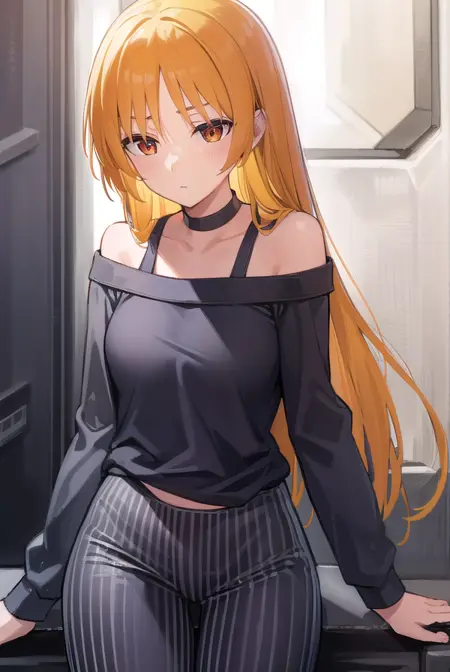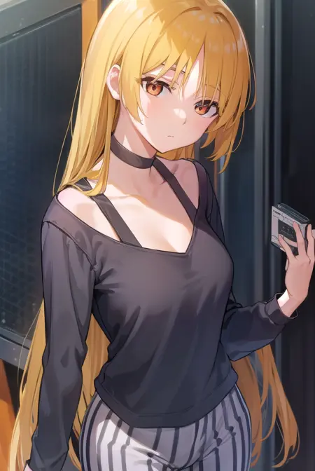 黑色鞋子,黑色上衣,项圈,高跟鞋,长袖,裤子,上衣,条纹,条纹裤子,竖条纹,竖条纹裤子