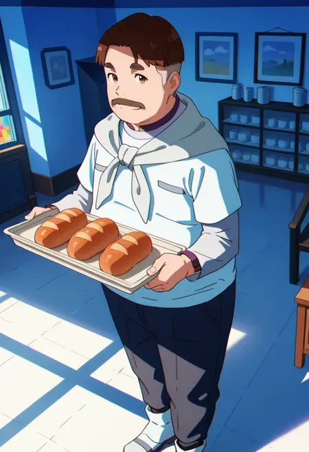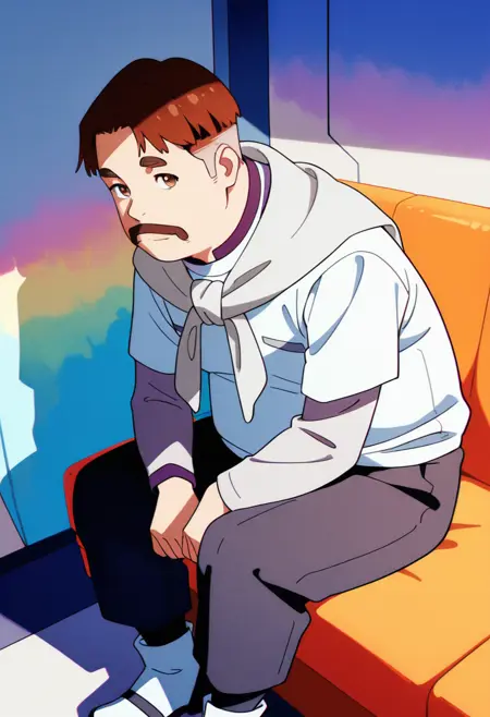 diffutoshixx, 1boy, alternate_hair_style, two-tone hair, brown hair, mustache, brown eyes, chubby, solo,