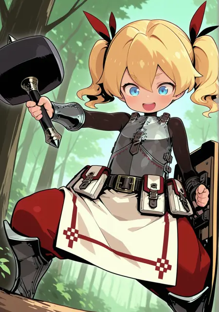 推荐:金色头发,蓝眼睛,卷发,装甲靴,腰带包,胸甲,红丝带,发带,额头前的头发,浓眉,长袖,双马尾,红色裤子,紧身衣,腰带扣,