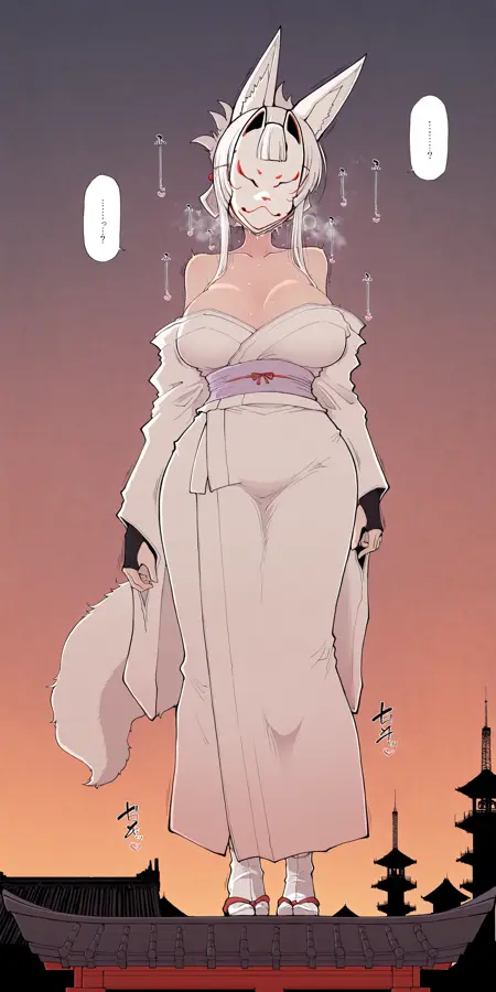 Fox girl,off shoulder,kimono,fox mask,fox tail,tabi,big breast,fingerless gloves,sash,slipper,white hair,