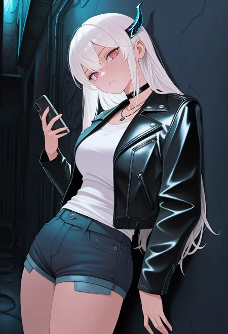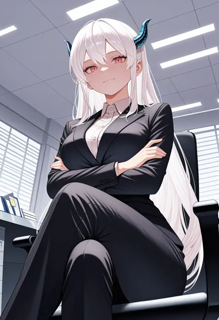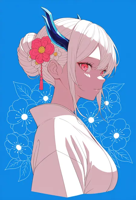Uz3nKyouk4, pink eyes, white hair, long hair, hair ornament, fake horns, blue horns