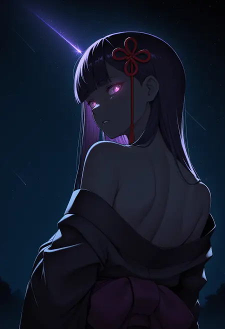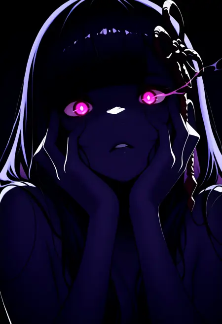 Y4m4sh1roRen, purple eyes, purple hair, long hair, blunt bangs, hair ornament