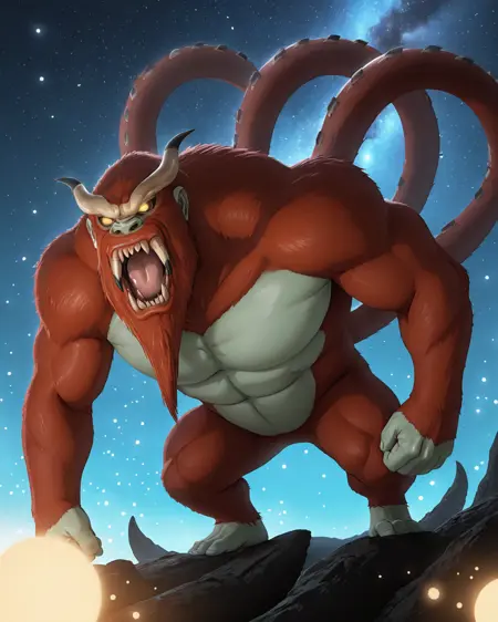 no human, monster, gigantic, 4 tails, yellow eyes, fangs, muscular, red skin,