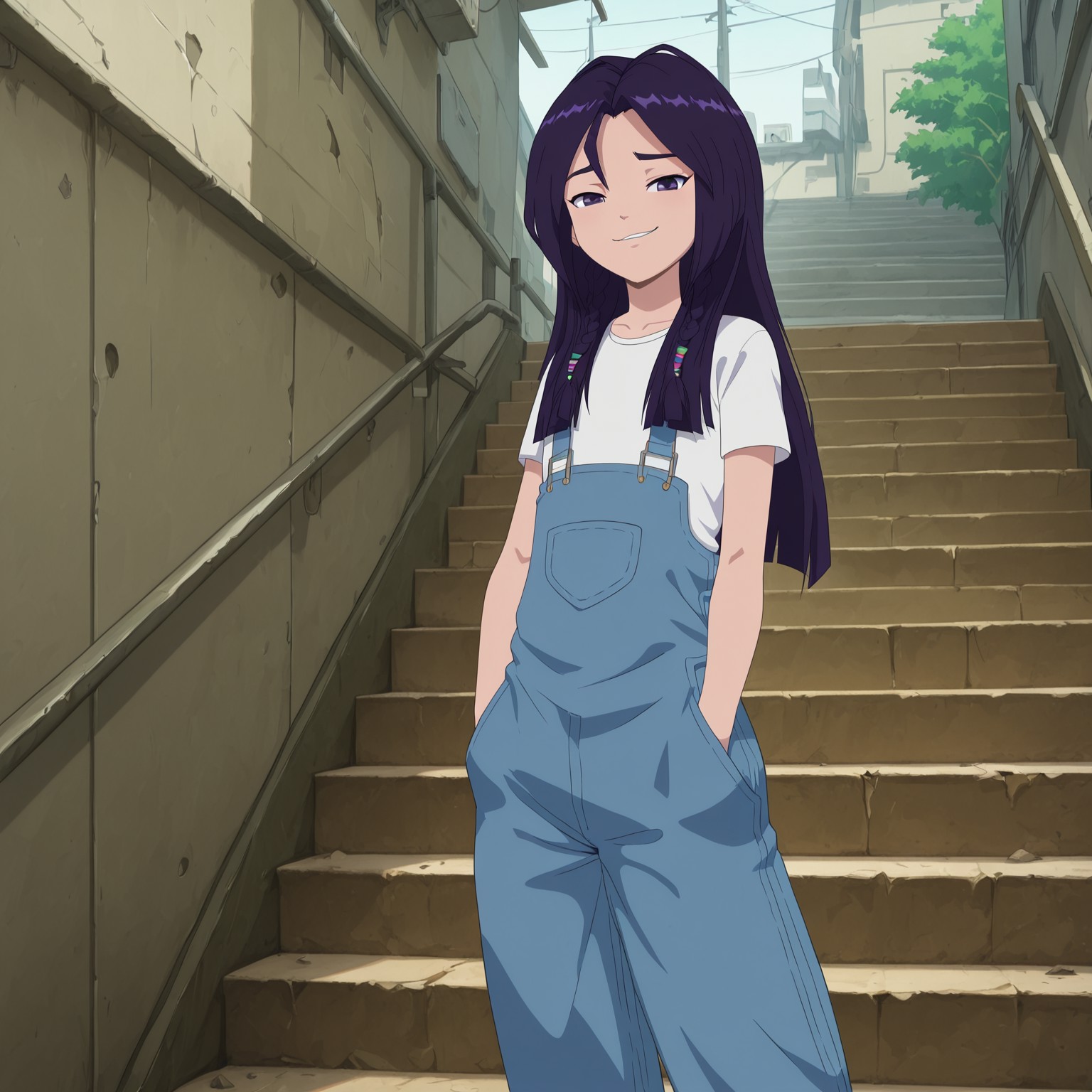 cleo_ma, long hair, purple hair, braid, hair ornament, purple eyes, overalls, white shirt