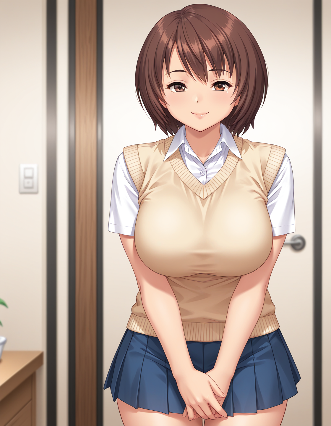校服, 毛衣背心, 白色衬衫, 有领衬衫, 短袖, 蓝色裙子, 迷你裙, 百褶裙