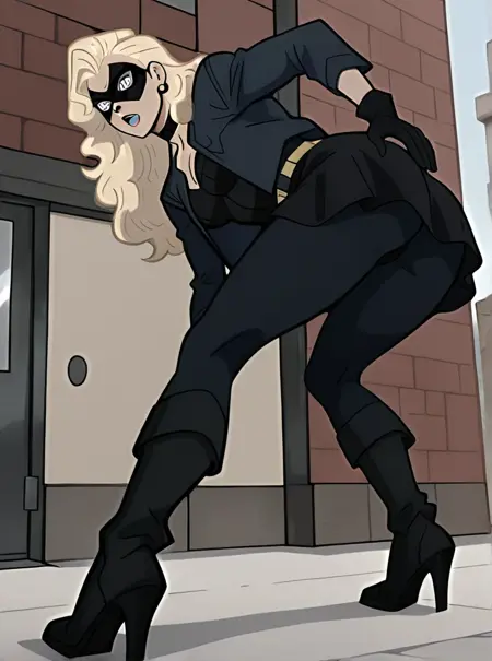 복장: 오픈 재킷, 도미노 마스크, 구조적 재킷, 치마, 타이츠, 검은 초커, 검은 장갑, 금색 벨트 버클, 검은 하이힐 부츠