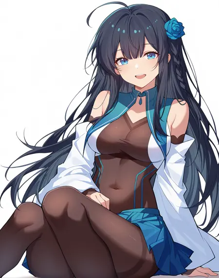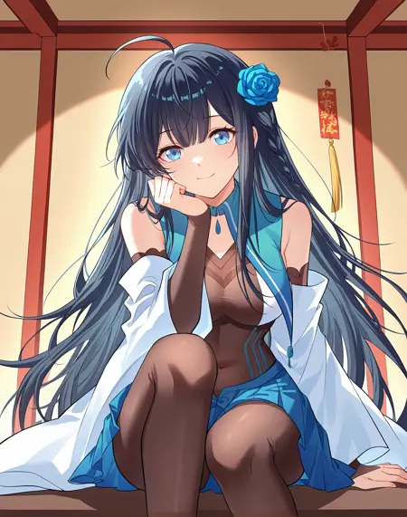 yuer, 1girl, hair ornament, detached sleeves, pantyhose, blue eyes, long hair, black hair, hair ornament, breasts, ahoge, braid, hair flower, blue skirt, blue flower, bodystocking