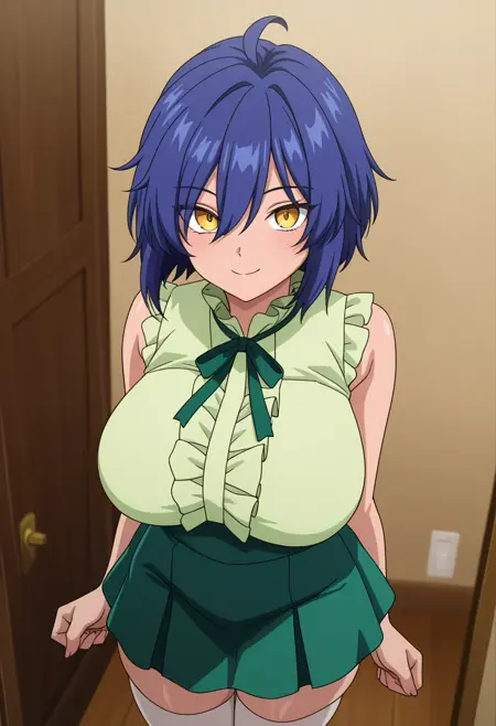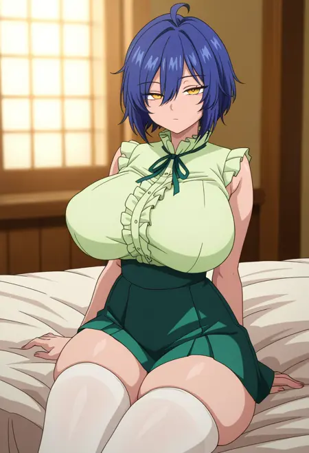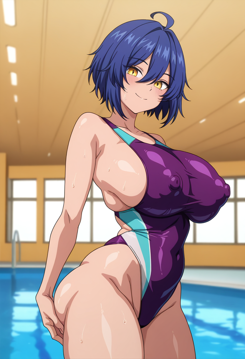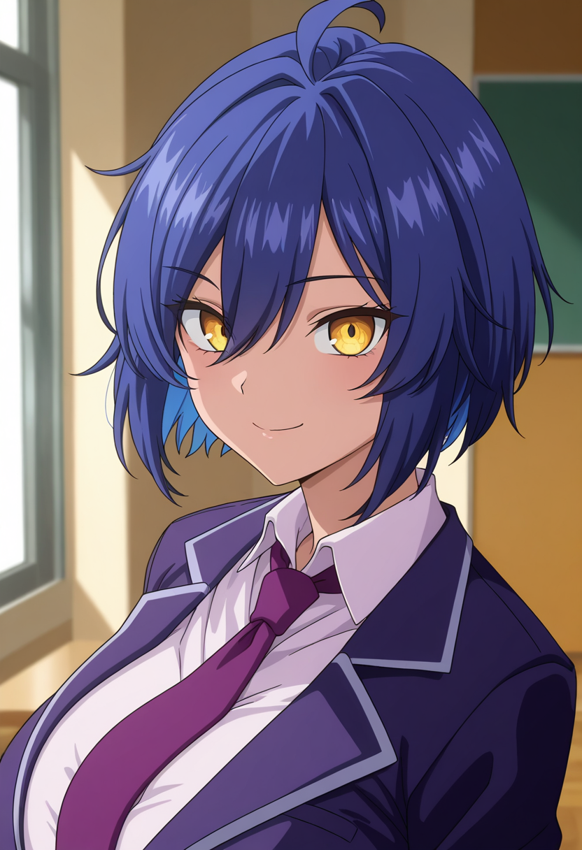 • marinaww, yellow eyes, blue hair, short hair, hair between eyes, ahoge, large breasts,