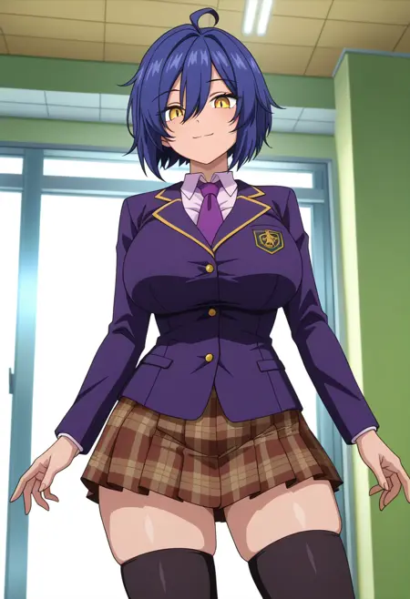 school uniform, purple necktie, taut jacket, purple jacket, blazer, light purpl shirt, collared shirt, long sleeves, brown pleated skirt, plaid skirt, zettai ryouiki, black thighhighs,