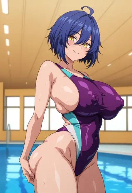 - marinaww, yellow eyes, blue hair, short hair, hair between eyes, ahoge, large breasts,