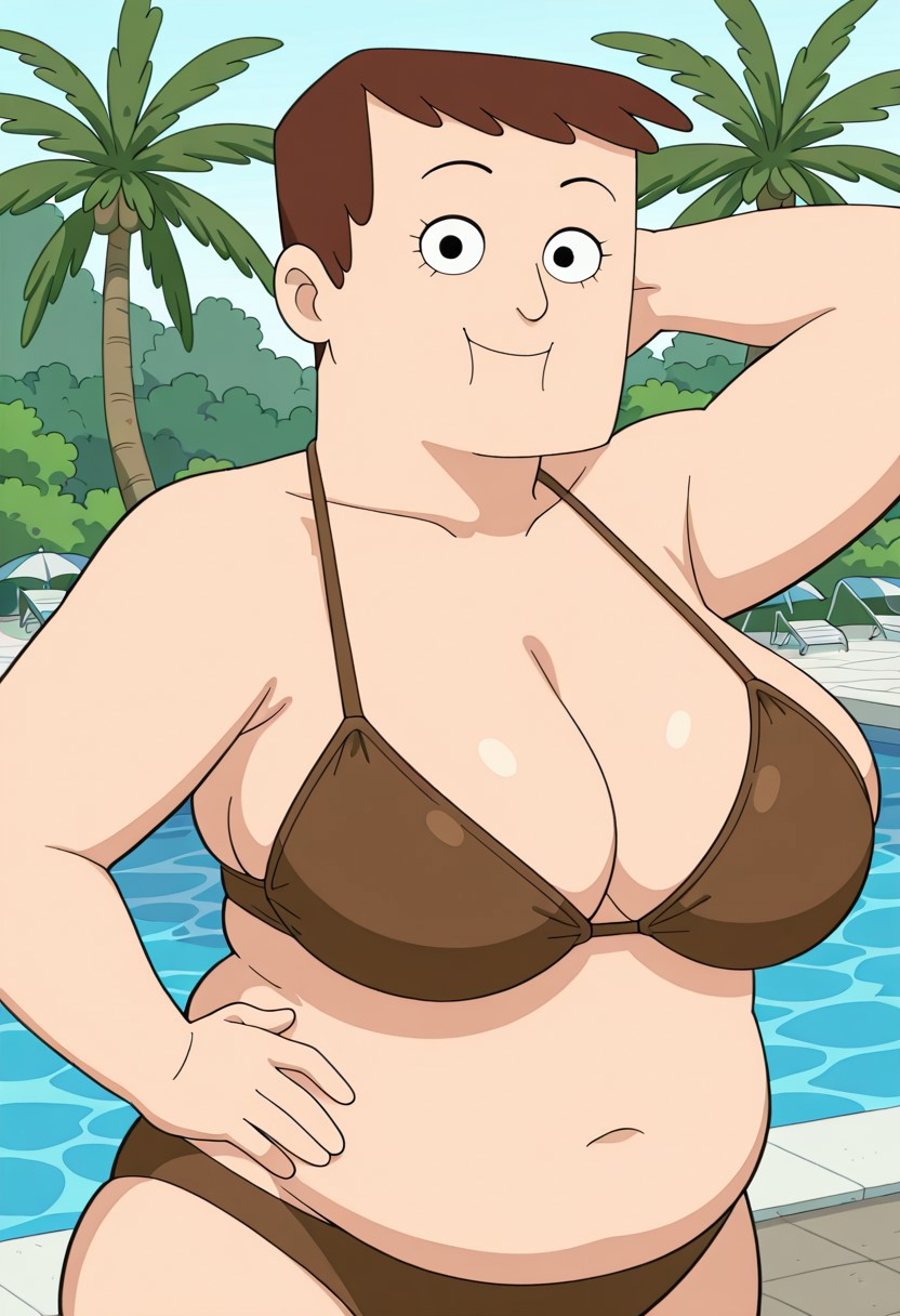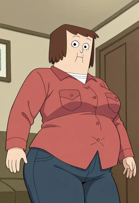 1girl, solo, Ejrandell_IL, 통통한 몸매, 네모난 머리, 밝은 피부, 갈색 머리, 단발, 검은 눈, 빨간 긴 소매 버튼 셔츠, 흰색 언더셔츠, 진한 파란 청바지, 갈색 부츠
