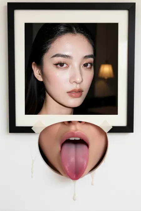 嘴提示词:女生的嘴巴从墙上的破洞中伸出,张开嘴巴流出口水。在墙上的正上方放在一个相框里面摆放着该女生的照片