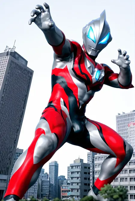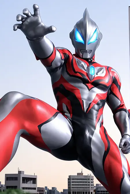 ultraman g33d, bodysuit, tokusatsu, alien, glowing eyes, blue eyes, boots