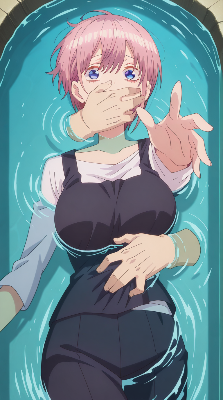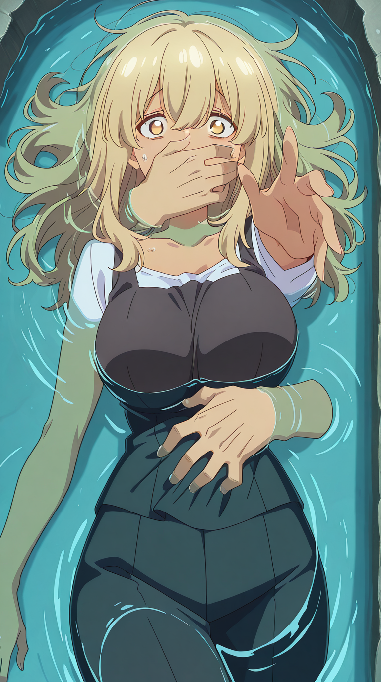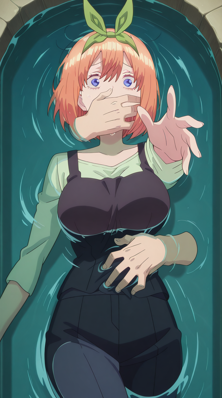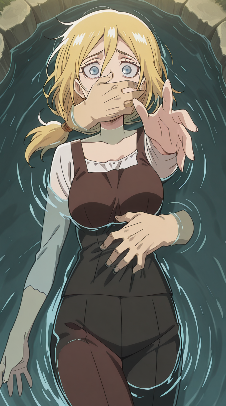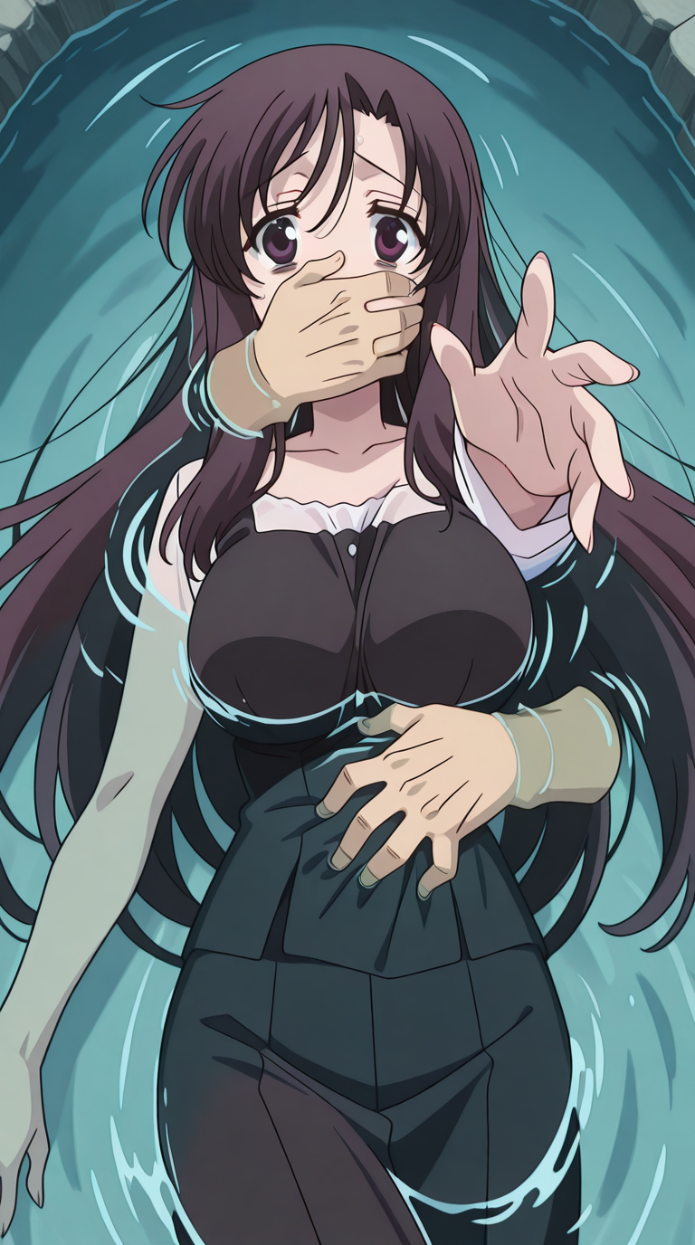 lora:into-the-deep-illustriousxl-lora-nochekaiser:1, into the deep, solo, disembodied limb, covering another's mouth, grabbing another's stomach, reaching, reaching towards viewer, partially submerged, water, scared, outstretched arm,