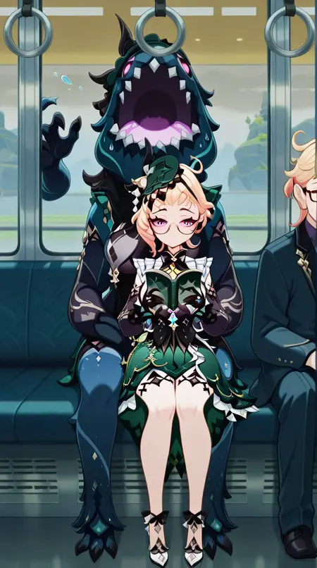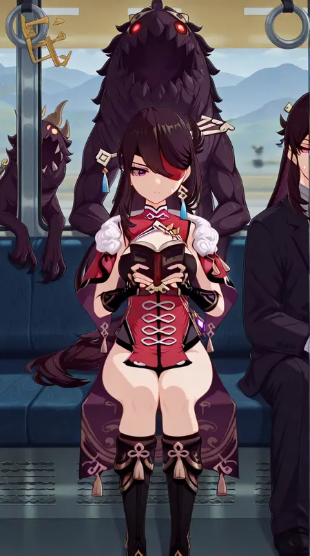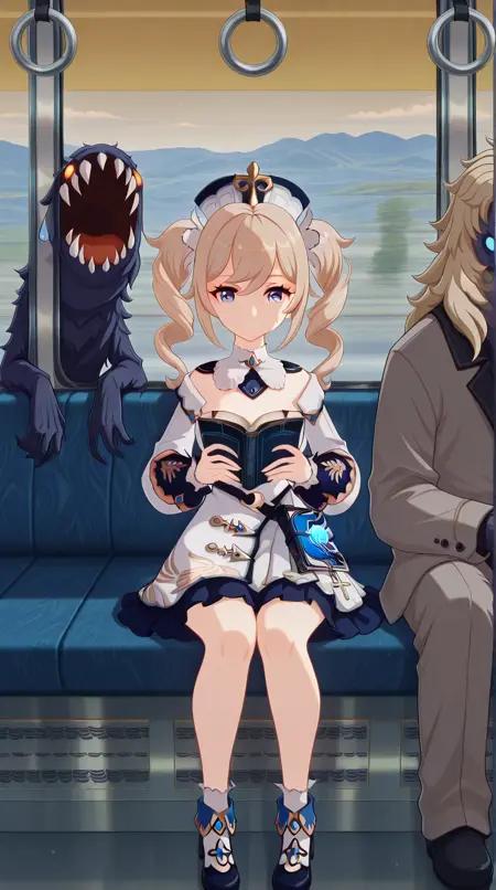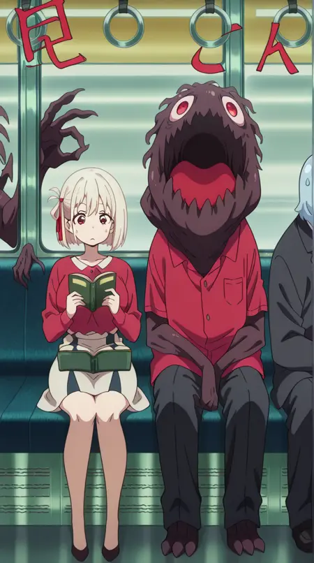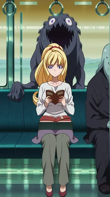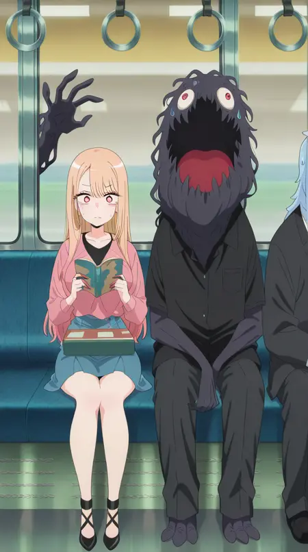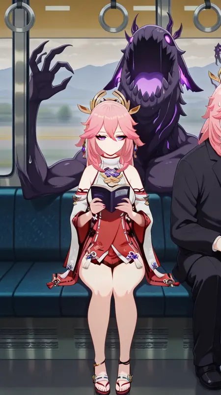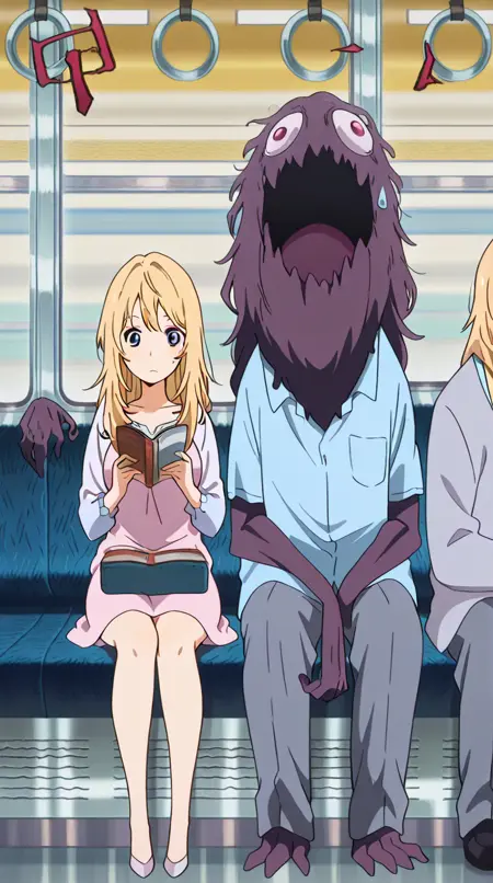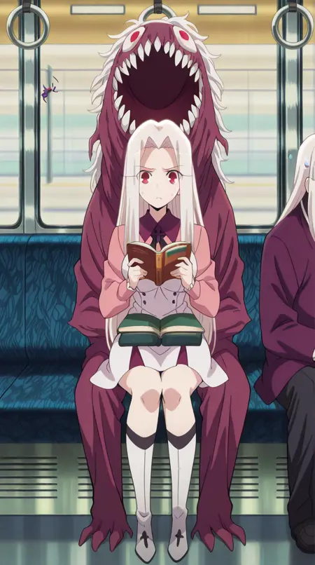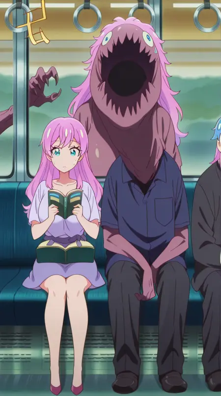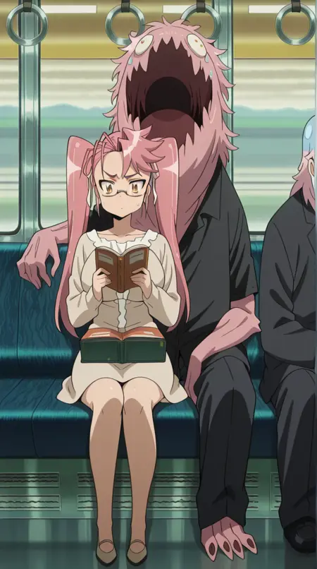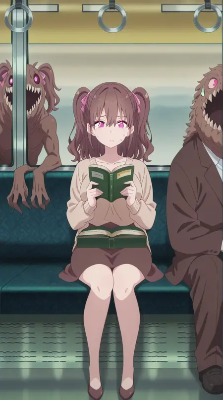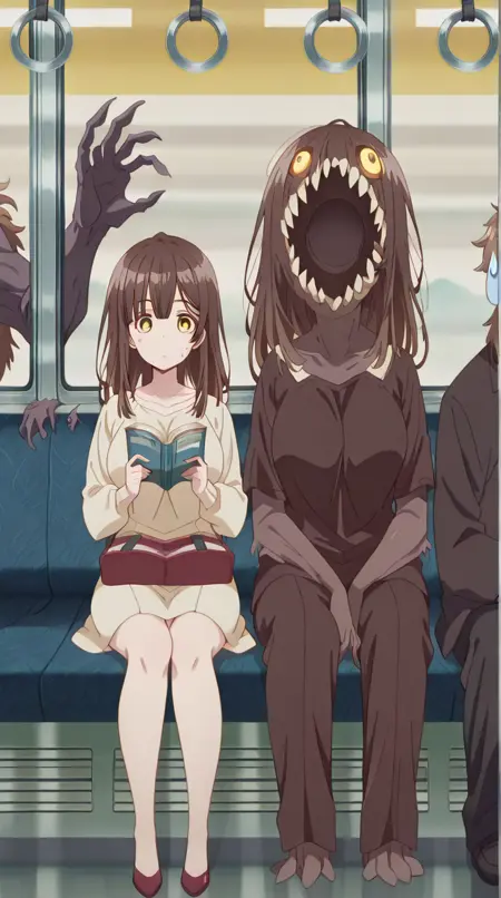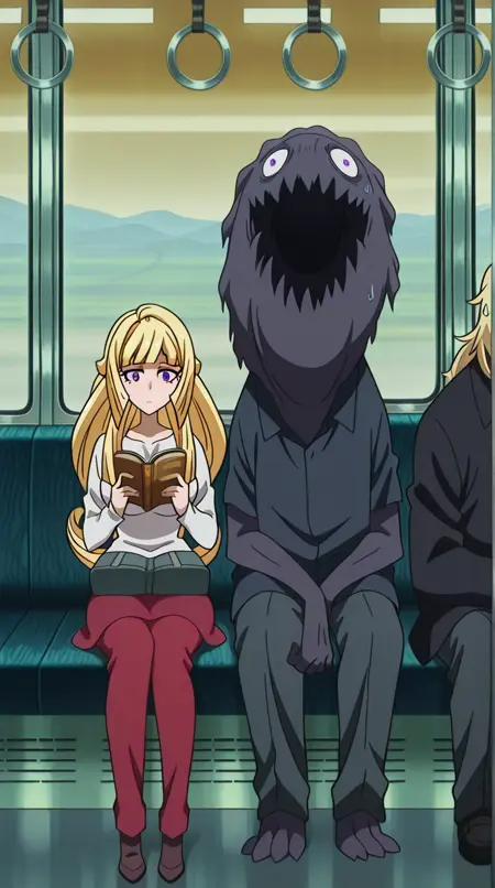 lora:mierukochan-anthology1-illustriousxl-lora-nochekaiser:1, mierukochan anthology1, solo, 1boy, holding, sitting, sweatdrop, book, holding book, monster, open book, reading, train interior,