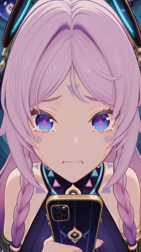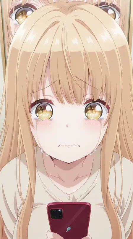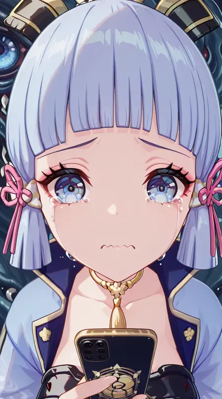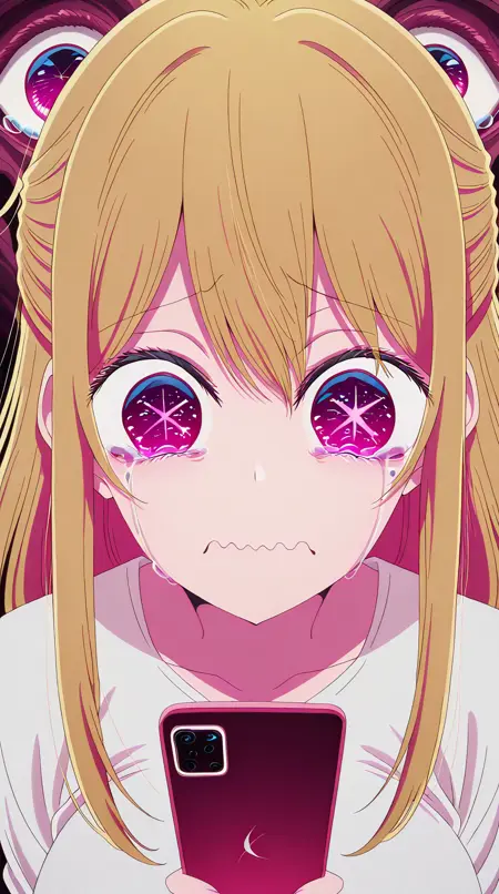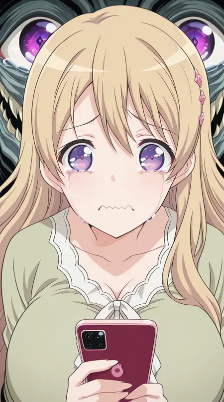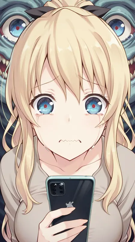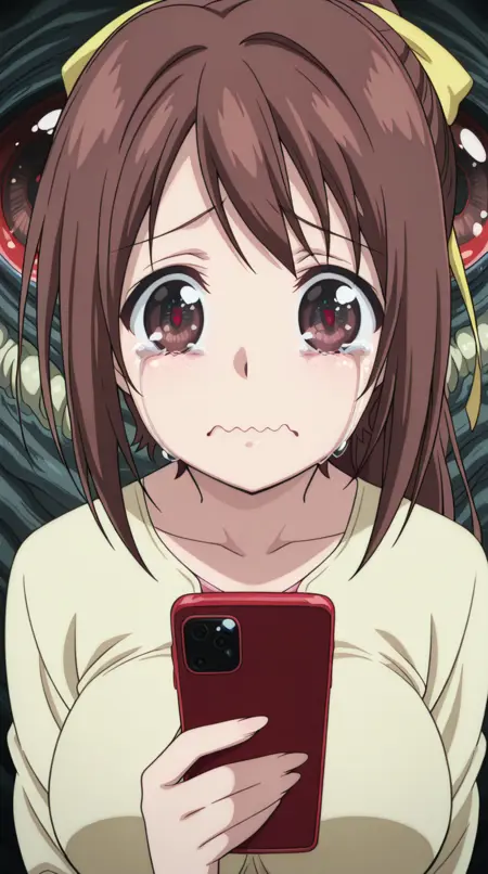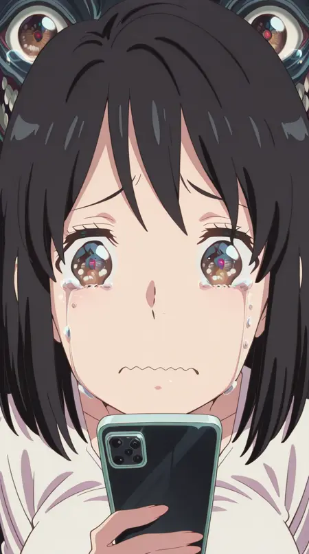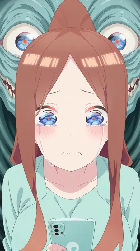 lora:mierukochan-vol1-illustriousxl-lora-nochekaiser:1, mierukochan vol1, シングル, 視聴者を見つめる, 持っている, 上半身, 泣き顔, 携帯電話, 波打つ口, 携帯電話, 泣いている, スマートフォン, 目の反射, 怪物, 目の焦点, 反射,