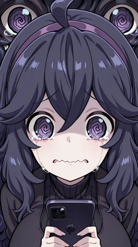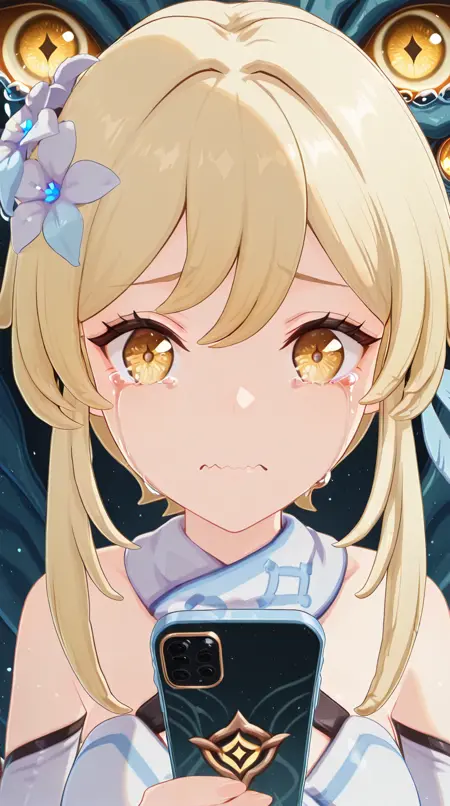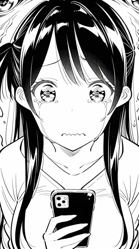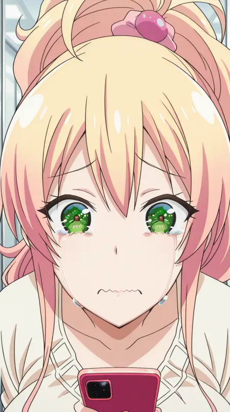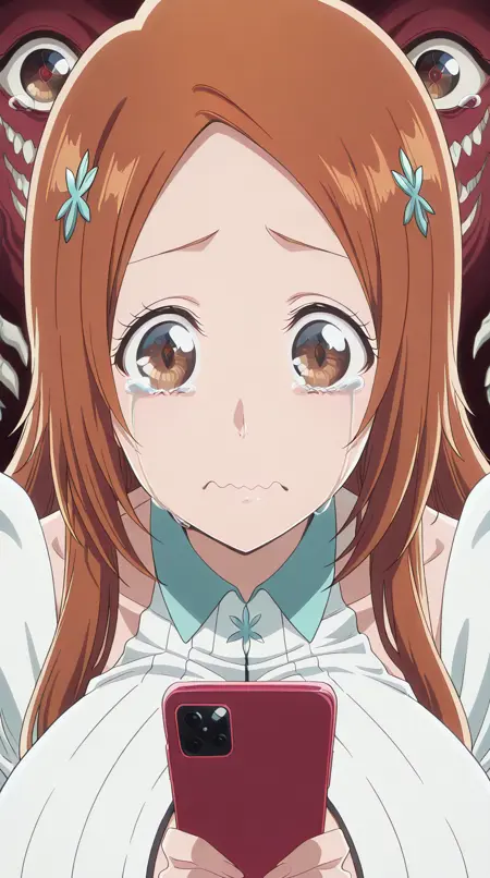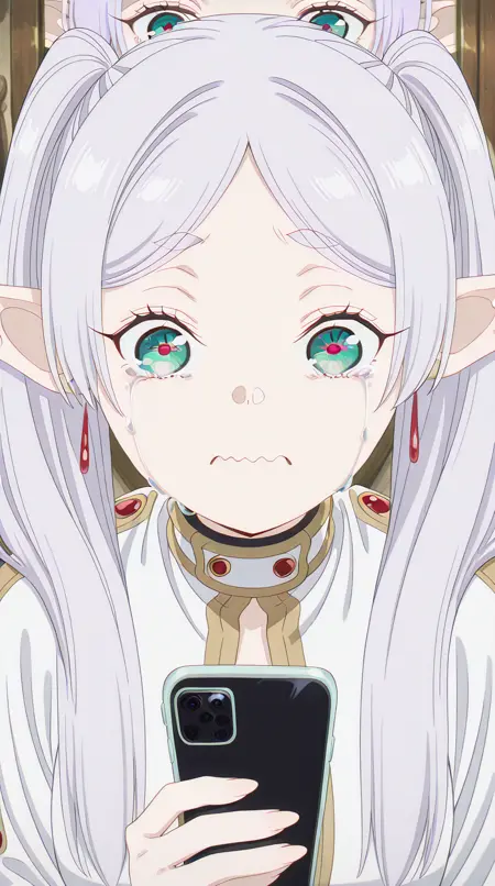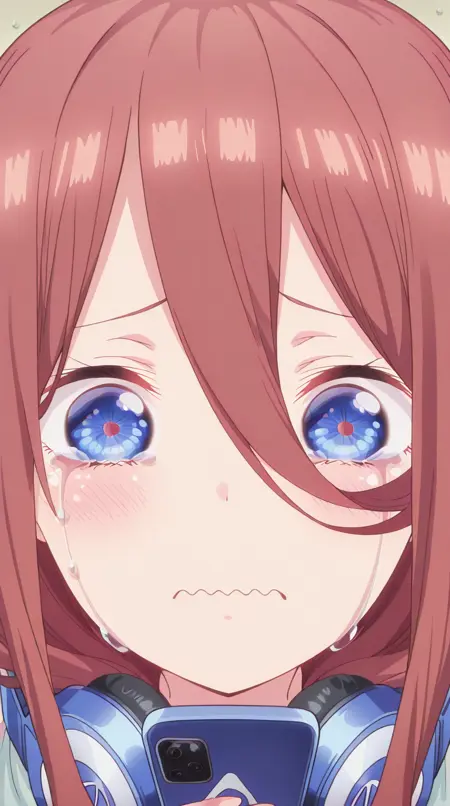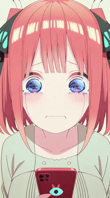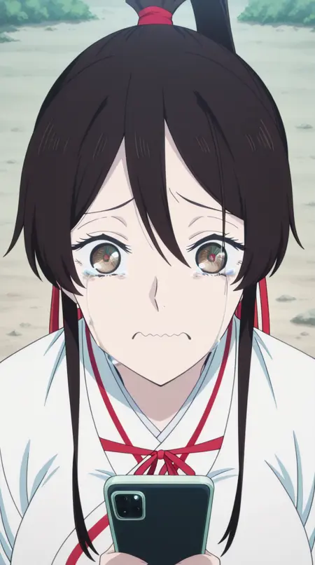 lora:mierukochan-vol1-illustriousxl-lora-nochekaiser:1, mierukochan vol1, シングル, 視聴者を見つめる, 持っている, 上半身, 泣き顔, 携帯電話, 波打つ口, 携帯電話, 泣いている, スマートフォン, 目の反射, 怪物, 目の焦点, 反射,