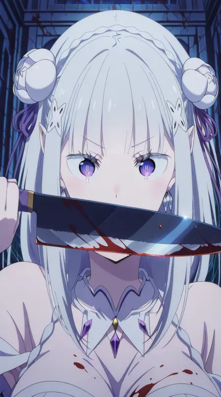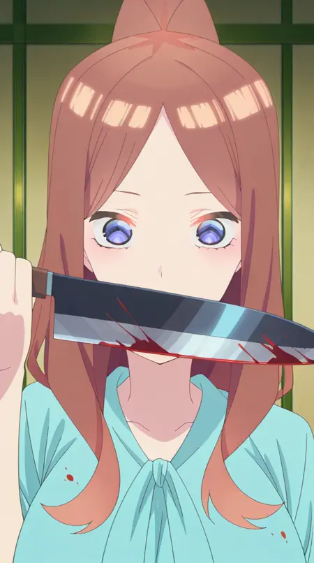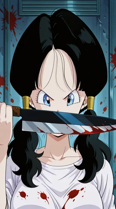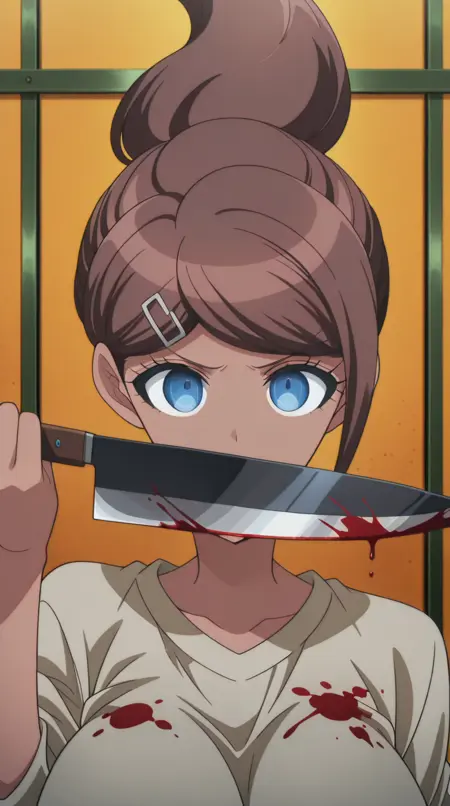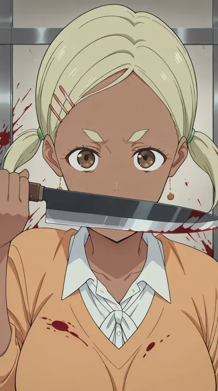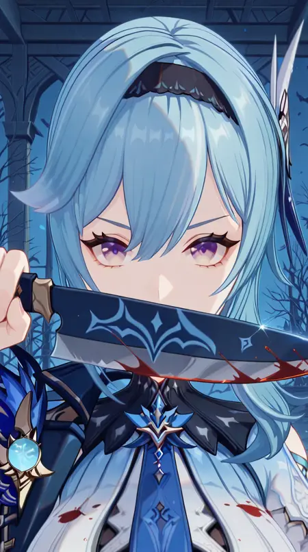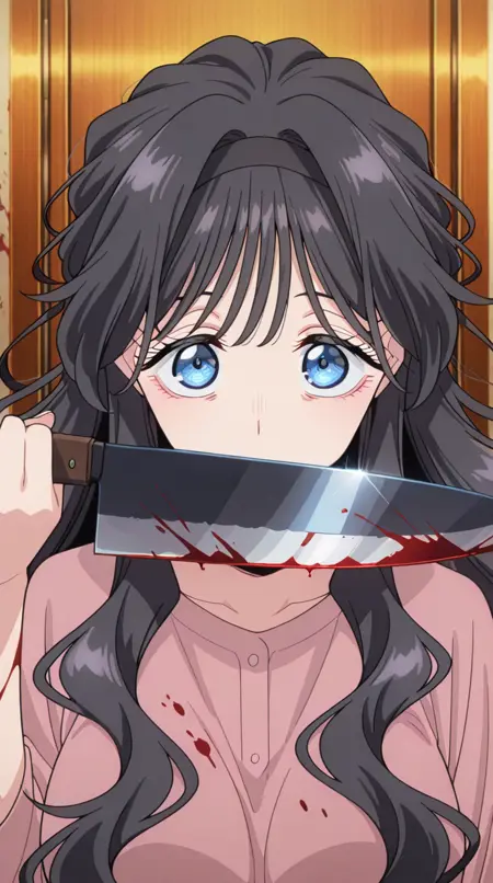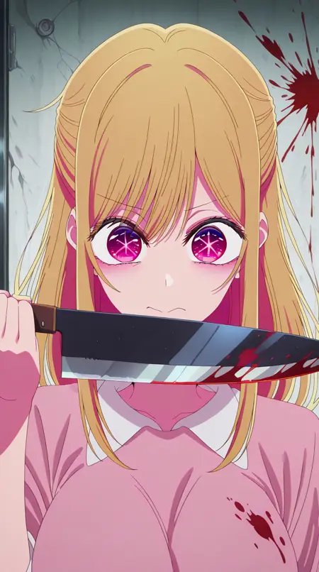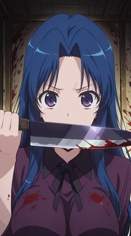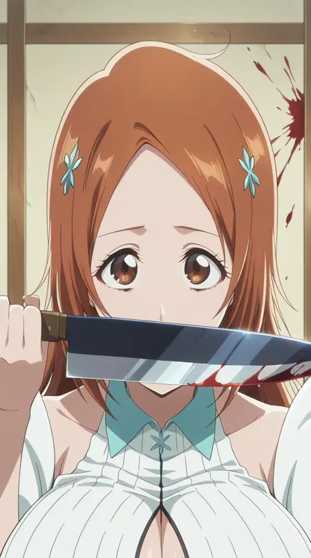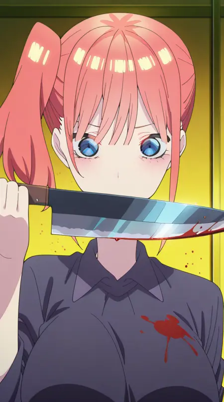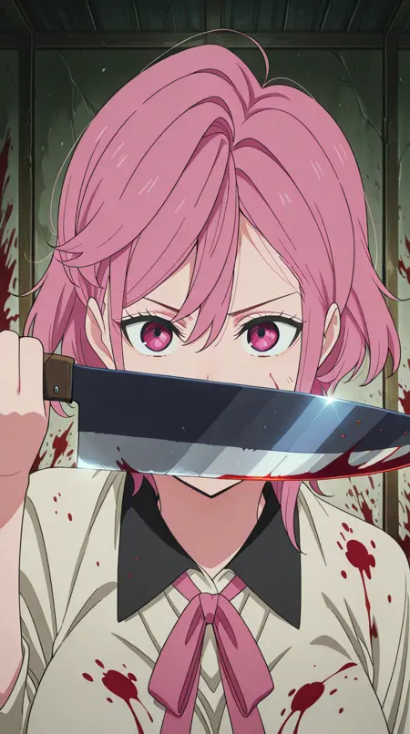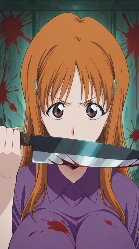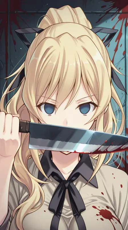 lora:pumpkin-night-vol6-illustriousxl-lora-nochekaiser:1, pumpkin night vol6, solo, 시청자 바라보기, 손에 들고 있음, 상반신, 무기, 무기 들고 있음, 피, 칼, 칼 들고 있음, 옷에 피, 피 튀김, 무기에 피, 칼에 피,