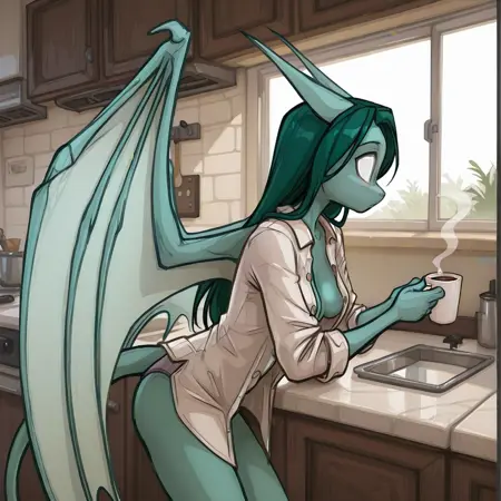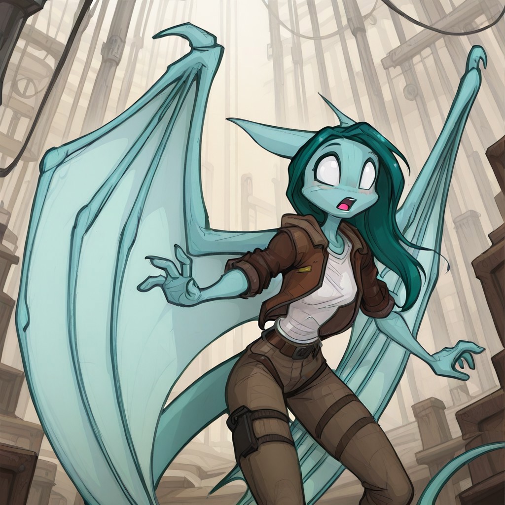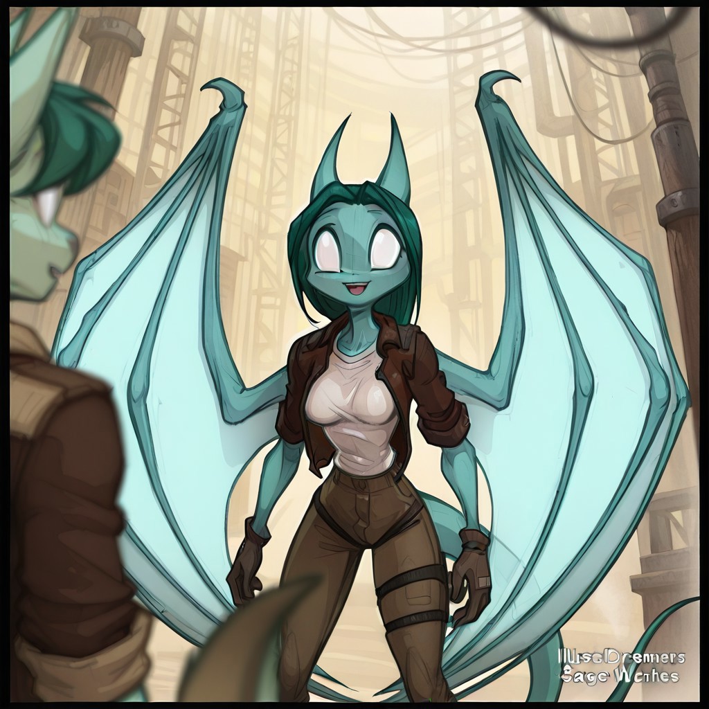 sage_(dreamkeepers), animal ears, 1girl, solo, furry, furry female, wings, long hair, colored skin, white eyes, tail, demon tail, breasts, green hair, monster girl, demon wings,