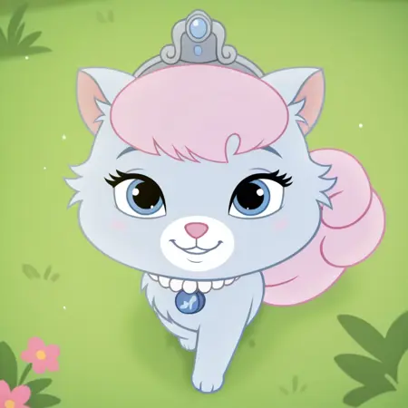 タグ: フェラル、猫、ピンクの髪、ティアラ、青い目、ネックレス、動物の耳、白い口吻、ピンクの鼻、灰色の毛、まつげ、ピンクの尾
