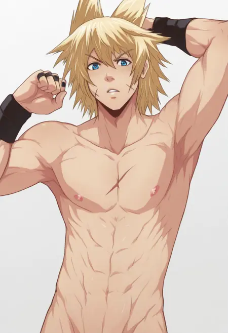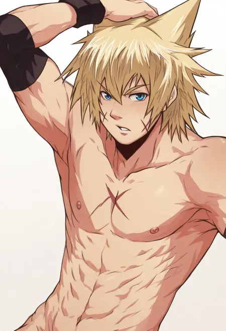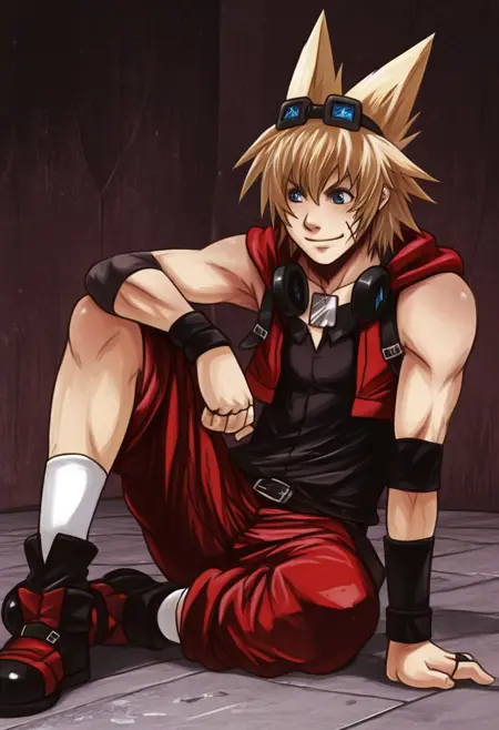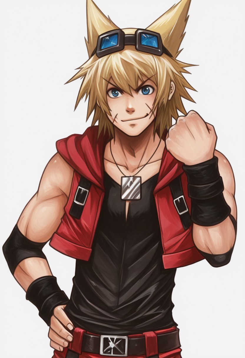 | 训练词汇 | Macchan, blonde hair, blue eyes, x scar on cheek, chest scar, choker, headphones, goggles, silver necklace, red sleeveless hoodie, open jacket, cropped jacket, black undershirt, crop top, midriff, black elbow bands, black wristbands, black rings, belt, red and black pants, rolled pants, white socks, red and black shoes已复制! |