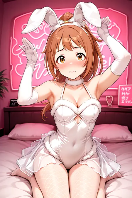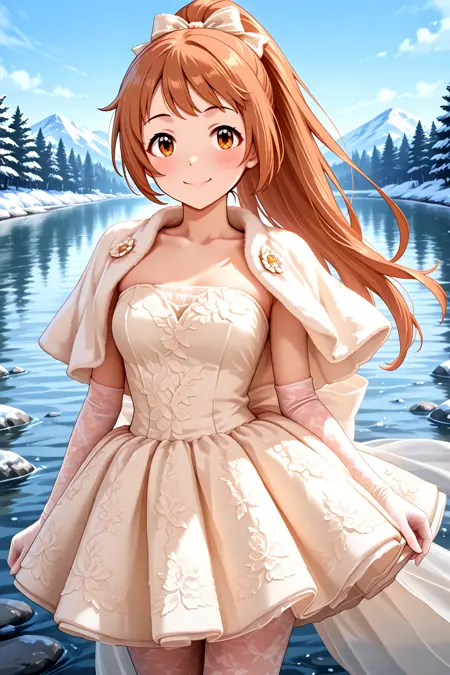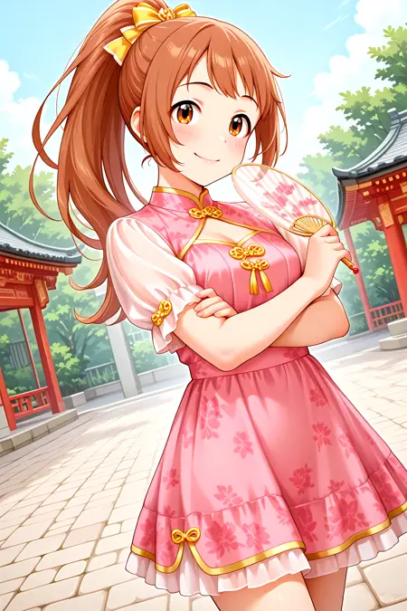 Tomoka_Cinderella, long hair, brown hair, brown eyes, hair bow, ponytail, breasts