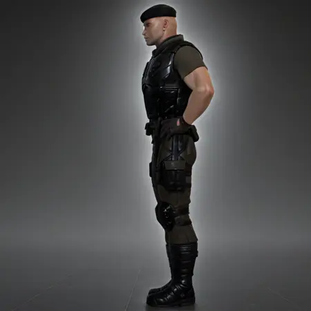 devinross,male,beret,bulletproof vest,rolled up sleeves,