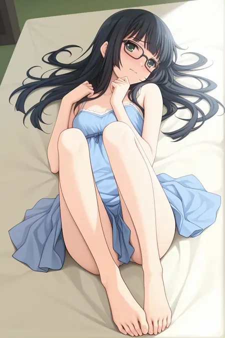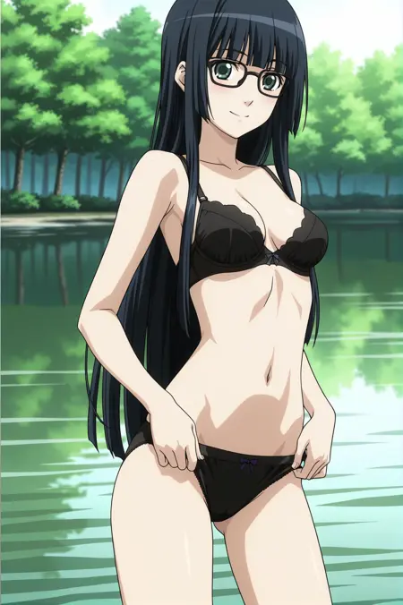 cpc-aoi, black hair, blunt bangs, long hair, green eyes, black glasses,