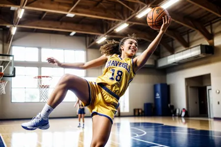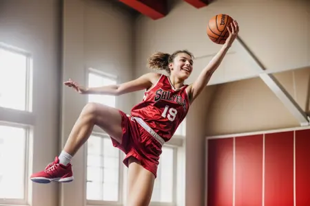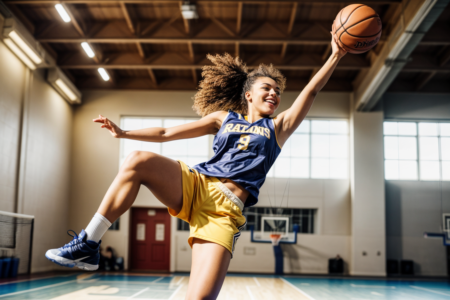 プロンプト: 白いショーツを履いたバスケットボール選手が空中に跳び上がり、手にボールを持ち、シュートしている。
