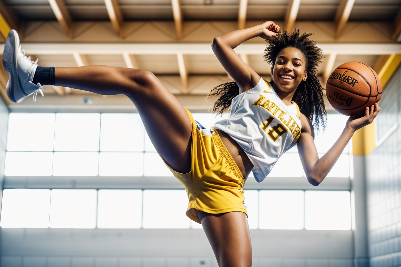 Prompt: basketball player in a white shorts jumps in the air,holding a ball in her hand and shooting it towards the hoop,